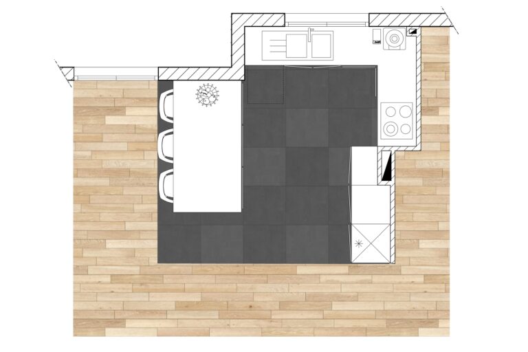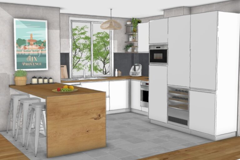 Pour l’avant-projet détaillé, un rendu 3D a été réalisé à leur demande. Cet outil précieux a permis au couple de mieux se projeter dans leur future cuisine. Les perspectives volumétriques et l’ambiance générale les ont aidés à valider leurs choix, tout en renforçant leur enthousiasme pour ce premier projet de rénovation.