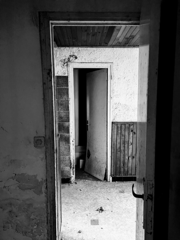 Circulation intérieure dégradée avant rénovation dans un T2 à Varces avec cloisonnement et état vétuste.