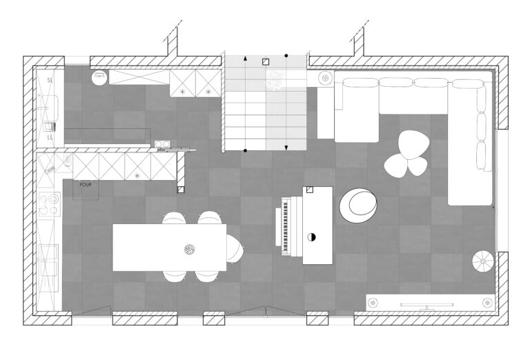 Le cœur du projet reposait sur une cuisine généreuse avec un îlot central multifonction, un salon confortable pouvant accueillir toute la famille, et une circulation parfaitement orchestrée autour d’un élément central : la cheminée.