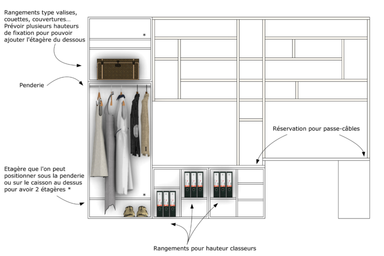 Meuble sur mesure intégrant rangements, penderie et bureau dans une chambre optimisée