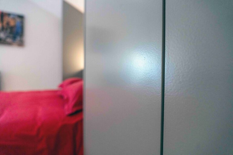 Dans la chambre parentale, les façades du placard sur mesure ont été peintes dans un rouge profond, encadré de gris anthracite, afin d’assumer pleinement la contrainte architecturale et d’en faire un élément structurant de la pièce.