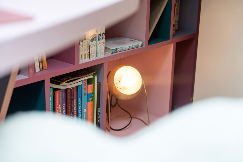 L’ensemble du mobilier a été réalisé sur mesure par un menuisier, en médium à peindre. Ce choix, privilégié par les parents, permet à leur fille de personnaliser les couleurs de sa chambre à mesure qu’elle grandit, notamment si elle souhaite un changement à la fin du collège.